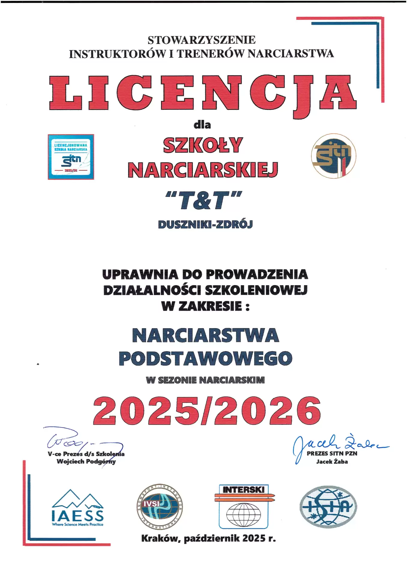 Szkoła T&T Zieleniec jako jedna z nielicznych w Zieleńcu posiadają licencję Stowarzyszenia Instruktorów i Trenerów Narciarstwa SITN PZN. Licencja uprawnia do prowadzenia działalności szkoleniowej w zakresie Narciarstwa Podstawowego i Kursów Kadrowych, a tym samym jest gwarancją, że współpracujemy z profesjonalnymi instruktorami, którzy uczą zgodnie z przyjętym programem nauczania przez PZN.