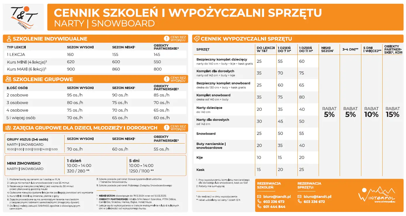 Zarówno szkoła i wypożyczalnia T&T Zieleniec działają codziennie przez cały sezon zimowy w godzinach pracy wyciągu Winterpol. Sprawdź w aktualnościach w jakich godzinach czynny jest wyciąg.