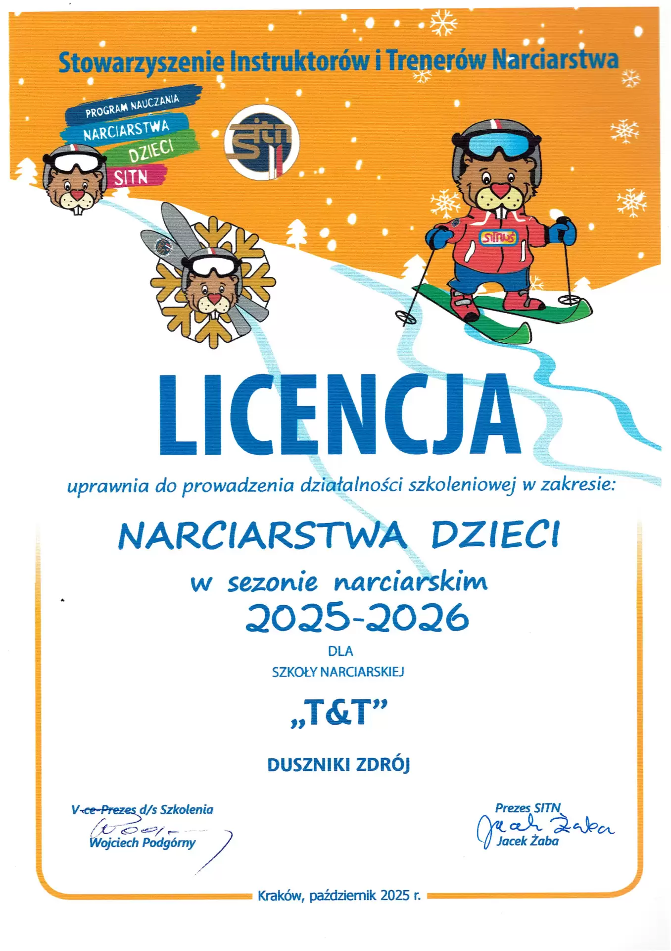 Szkoła T&T Zieleniec jako jedna z nielicznych w Zieleńcu posiadają licencję Stowarzyszenia Instruktorów i Trenerów Narciarstwa SITN PZN. Licencja uprawnia do prowadzenia działalności szkoleniowej w zakresie Narciarstwa Podstawowego i Kursów Kadrowych, a tym samym jest gwarancją, że współpracujemy z profesjonalnymi instruktorami, którzy uczą zgodnie z przyjętym programem nauczania przez PZN.